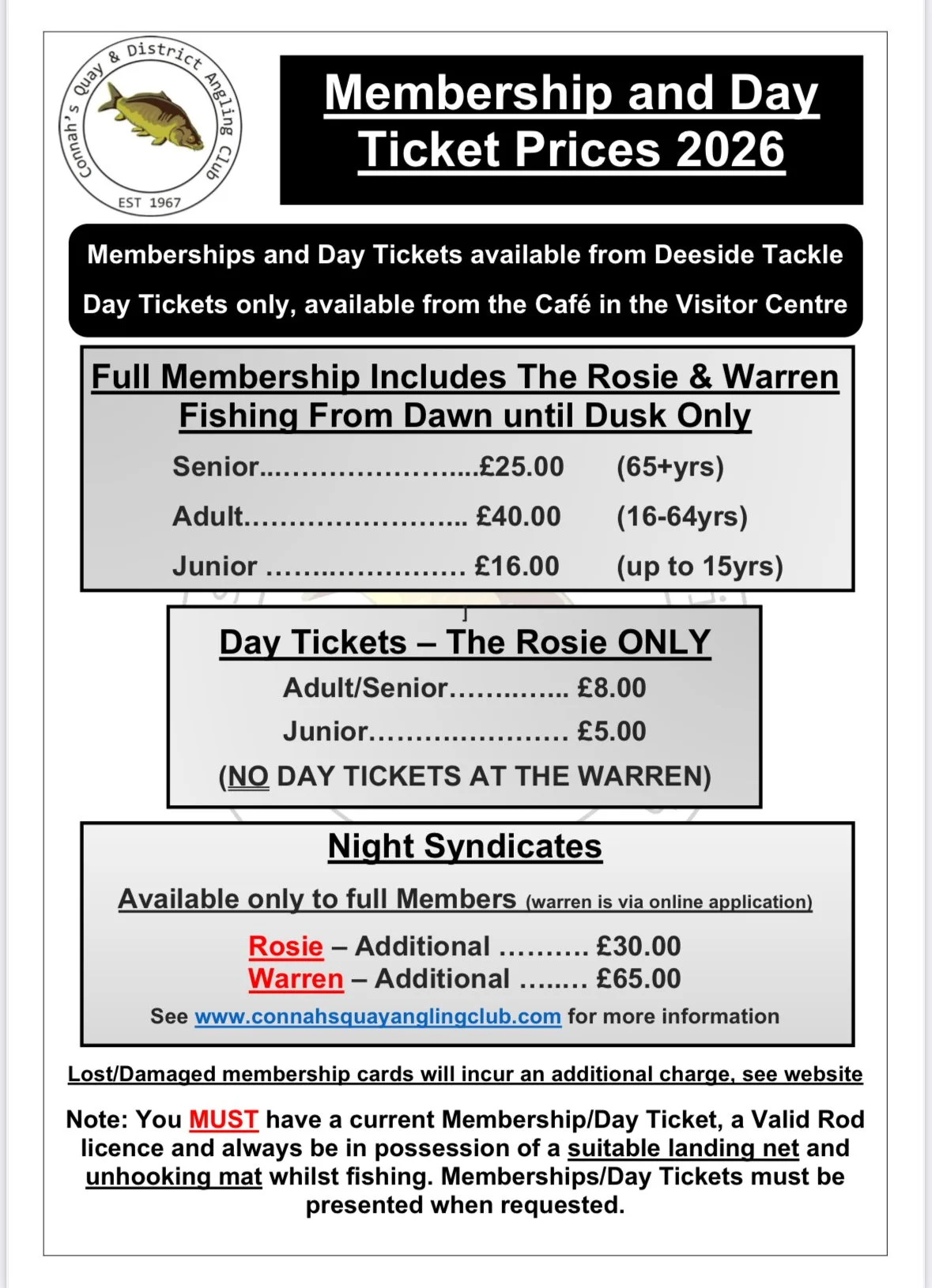 We are happy to announce that membership cards are now available for the 2026 season from Deeside tackle, when they reopen on Friday 12th December.