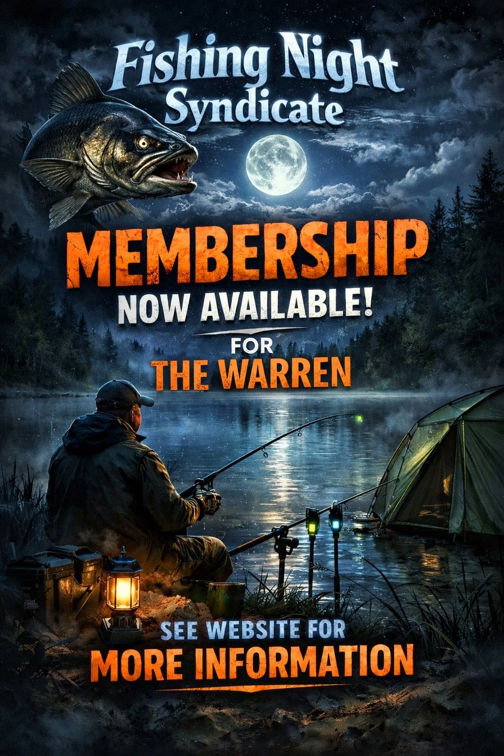 The form below is for Full Members to apply for the Night Syndicate available at the Warren only. Costs for this year will be £65.00 and will apply from January 1st 2026 until December 31st 2026. There are a very limited number of Warren Night Syndicate memberships available, and we are only permitted to have 4 night anglers on at any time. Maximum 48hr sessions will apply.